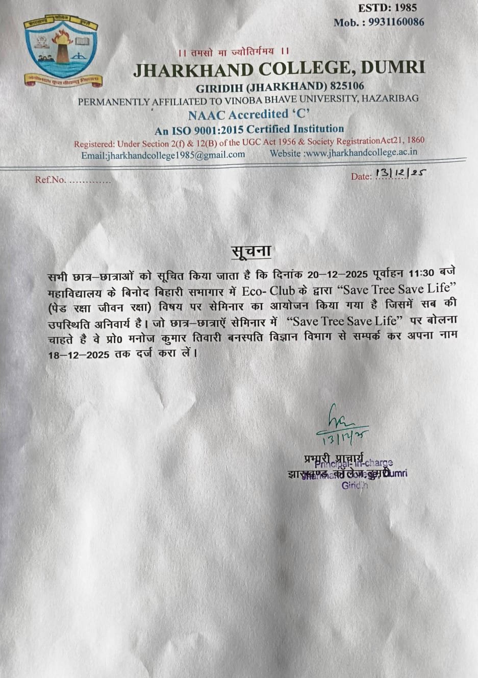Jharkhand College, Dumri , Giridih was established in the year 1985 with the contribution of local MLA, social worker educationist to enlighten the lamp of higher education in this area. The college is running in much pleasant environment around the block of Dumri & it is surrounded with Topchanchi , Nawadih, Bagodar & Pirtand Block.